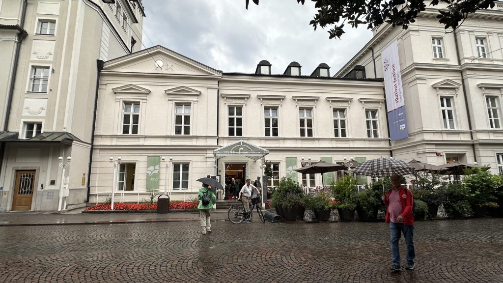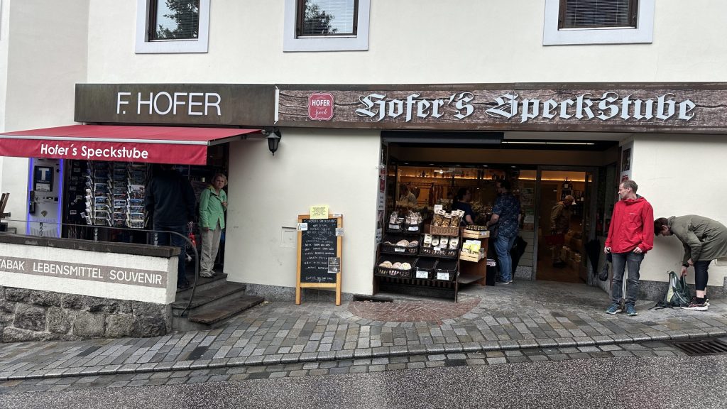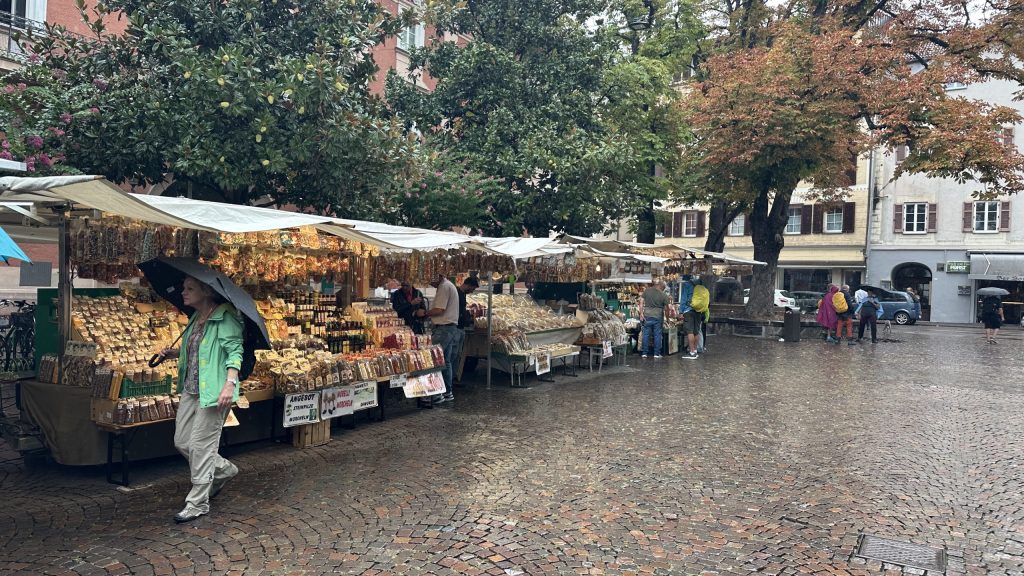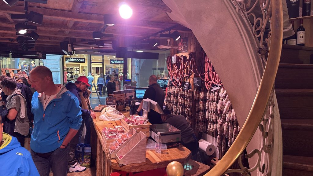 Es regnet auch in Meran. Wir sehen uns einige Delikatessen GeschĂ€fte an. Die Preise sind zum Teil heftig. Deshalb nehme einige der Speck, Schinken, und Salami Proben die schon mal angeboten werdenâŠ,