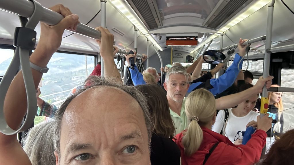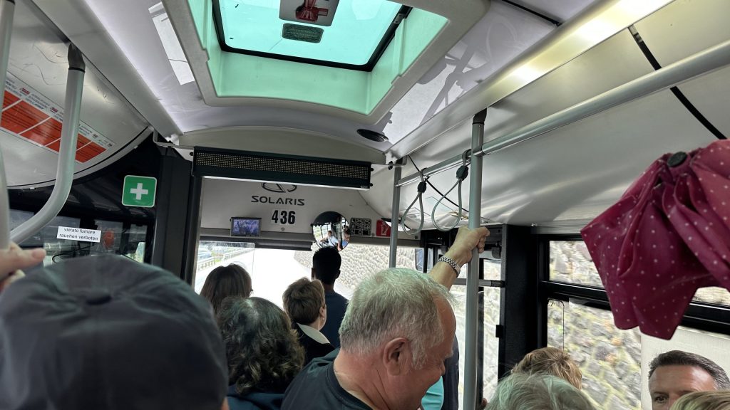 Und tatsĂ€chlich kommt der Bus, aber er ist voll. Der Busfahrer bremst abrupt, komprimiert die FahrgĂ€ste. Ăffnet die hinteren TĂŒren, und wir passen mit weiteren FahrgĂ€sten rein.