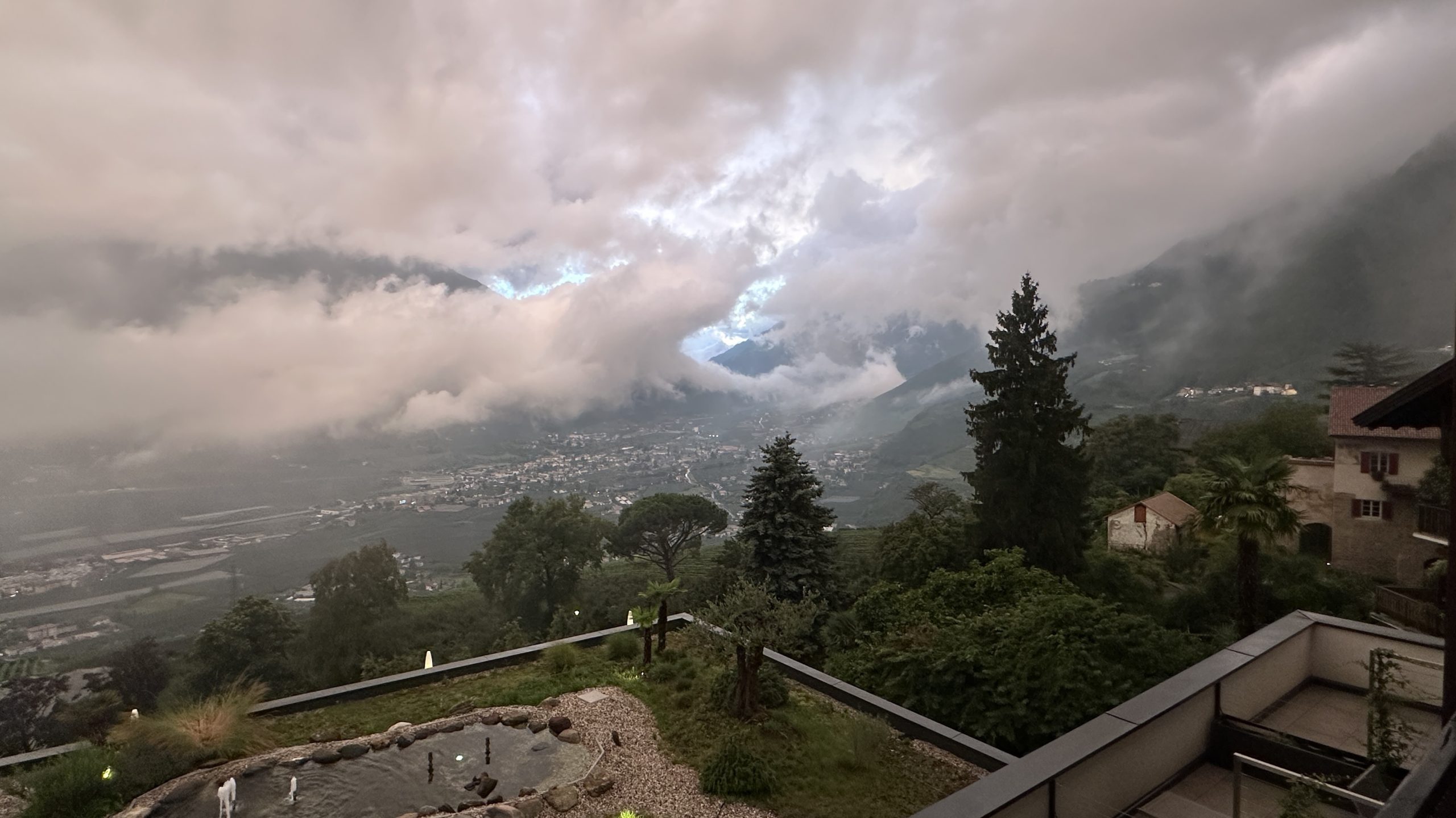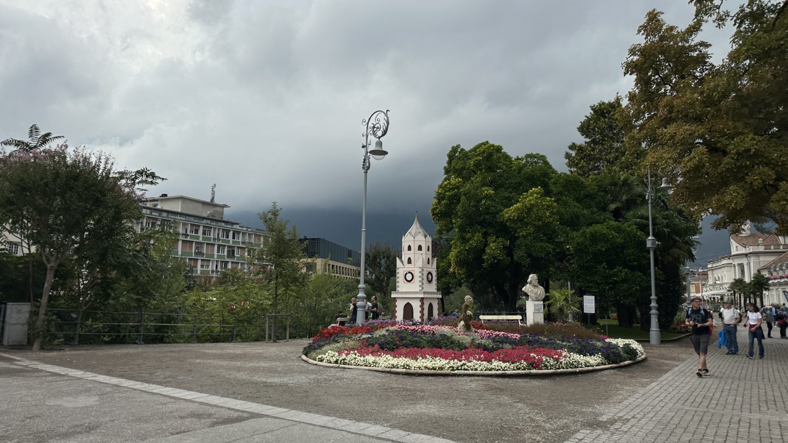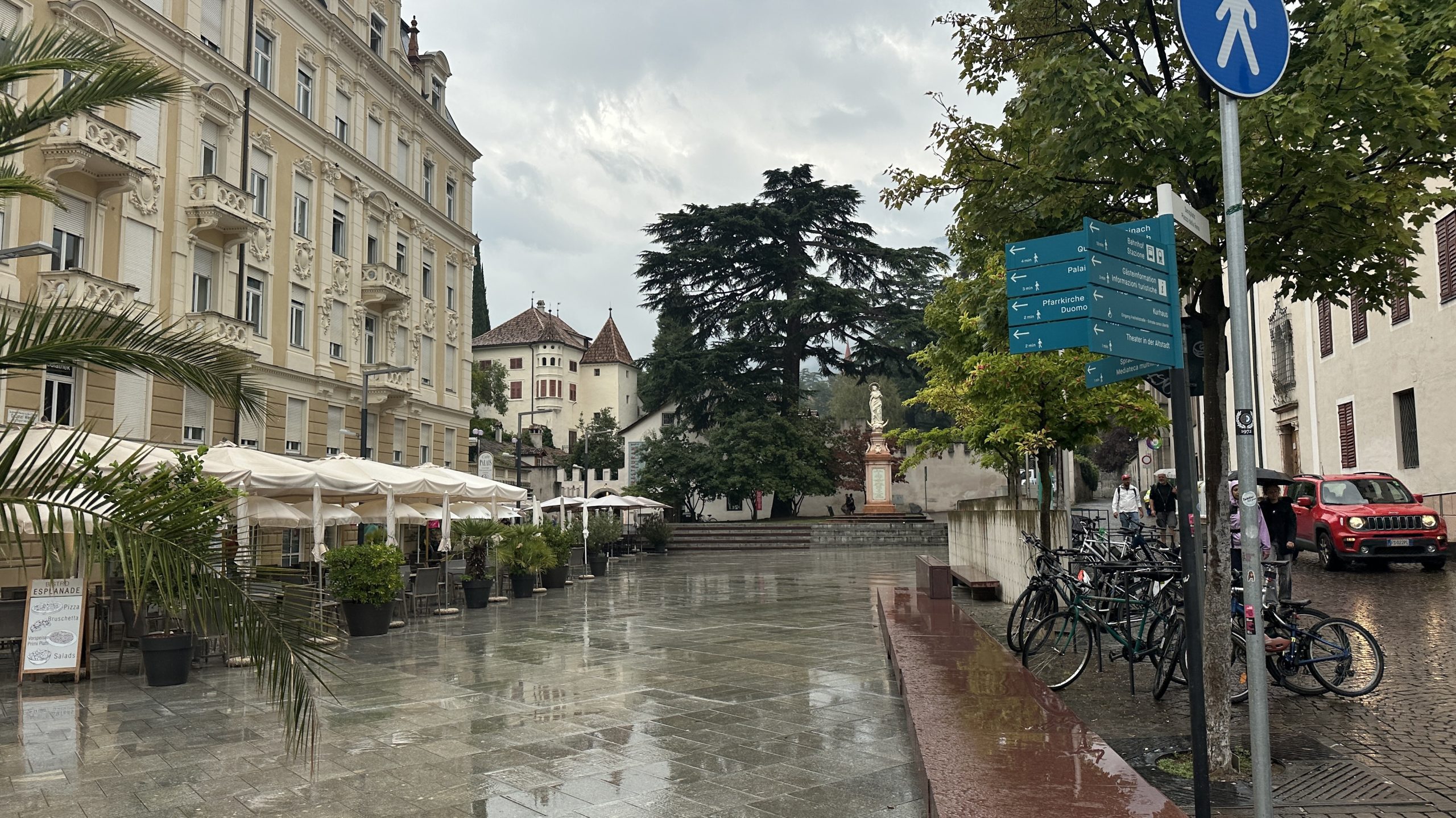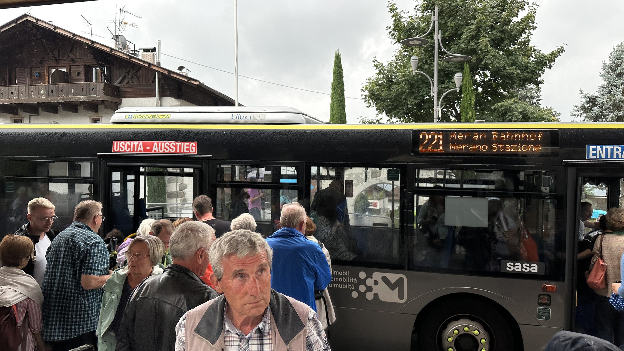 Bevor wir feststellen konnten ob es in Meran regnet, musste erst mal ein Bus kommen. Theoretisch fĂ€hrt er alle 15 Minuten, praktisch sind das min. 30 Minuten. Es gibt GerĂŒchte, die DB hat den Busbetrieb Tirol ĂŒbernommen.