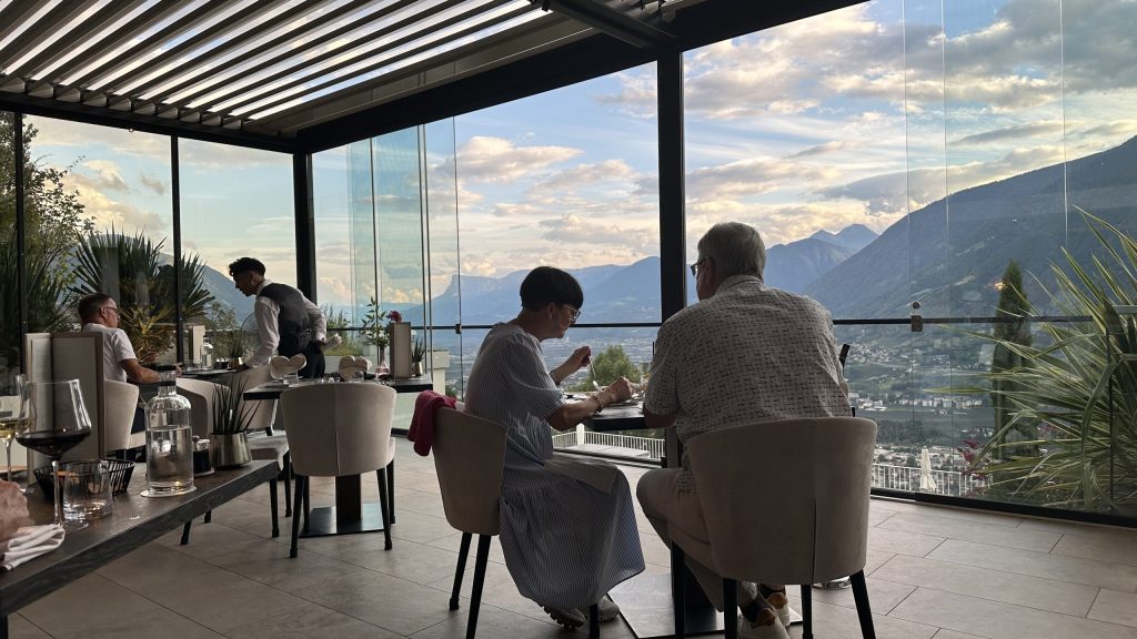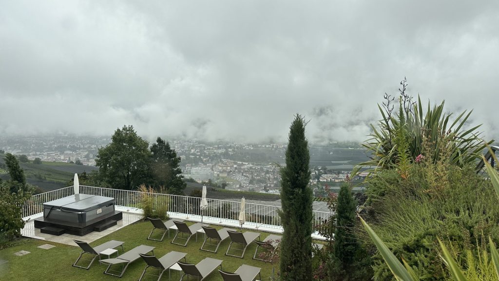 Dorf Tirol ist schön, es gefällt uns besser als Schenna. Das Hotel würden wir nicht noch einmal nehmen. Das Zimmer war sehr gut, imposanter Blick über das Tal. Aber das Hotel ist ziemlich verbaut. Die Fitness Räume sind ohne Fenster. Man kommt vom Wellness Bereich nur über einen separaten Aufzug in die Etagen mit Restaurant, Rezeption und Zimmer. Eine Treppe ist nur außen. Leider war ab Mittwoch der Aufzug defekt, so dass in den Wellness Bereich nur über die Außenanlage kommt. Mit den Filz Hotelschuhen bei Regen suboptimal.