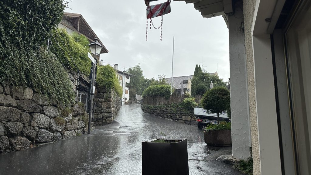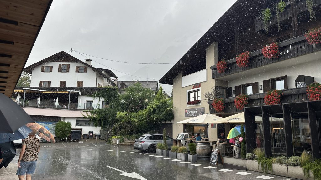 Kaum erreichen wir das Ortseingangsschild, beginnt es wieder zu schütten.