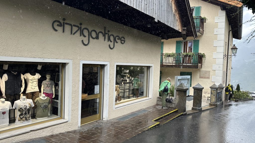 Dann geht es zum Laden „einzigartiges“, wo wir vorgestern ein paar T Shirts gekauft haben. Petras passen nicht. Gestern wollten wir dahin, Donnerstags Ruhetag. Heute von 10:30 – 18:00. Bis um kurz nach 11:00 war der Laden noch zu. Irgendwo steht bestimmt „bei Regen geschlossen“.