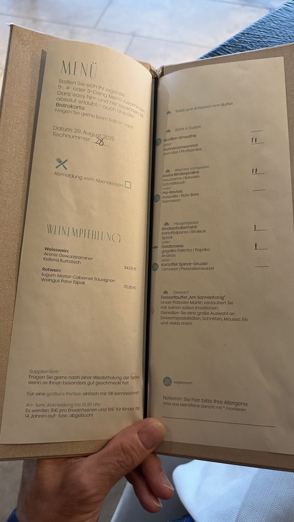 Das Abendessen. Optisch sehr schön und interessant. Aber der Geschmack war oft fad. Zum Glück war das Vorspeisenbuffet sehr reichhaltig, und hat das ganze etwas gerettet. Wir haben den Eindruck das Abendessen war gut gemeint, aber grüne Pastenkleckse, und filigrane Deko aus unbekannter geschmackloser Substanz hat uns nicht überzeugt. Ist die Deko zum Verzehren? Wir sind wahrscheinlich keine Gourmets, aber wir hatten schon andere Hotels gleicher Kategorie in dieser Gegend. Und das Essen fanden wir da besser. Petra meinte „Alles Killefit“. Passt.