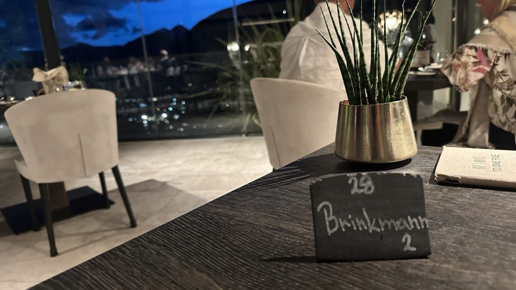 Unser Tisch war im Wintergarten, bei Sonne sehr schön. Bei Regen wurde der Teil geflutet, weil das Lamellendach keinen Starkregen aushält. Am letzten Tag war dann auch Winter in diesem Garten, es war zu kalt um lange beim Essen zu sitzen.