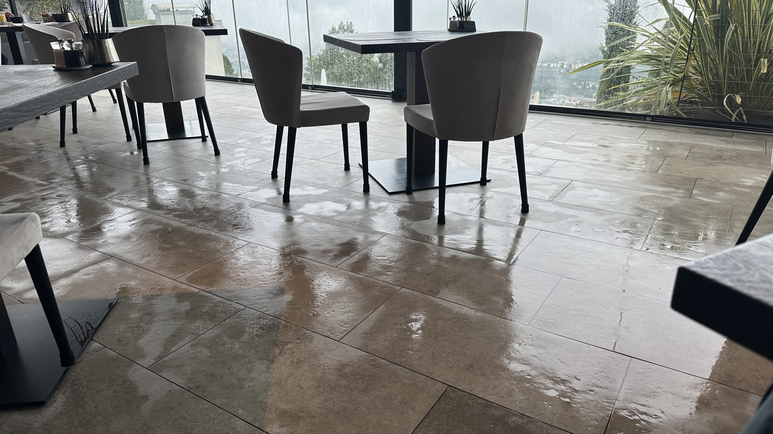 Heute Nacht ist sehr viel Wasser heruntergekommen. Wir haben unser Abendessen und das Frühstück im Wintergarten, der eine Art Lamellendach hat. Das hat den Wassermassen nicht standhalten können.