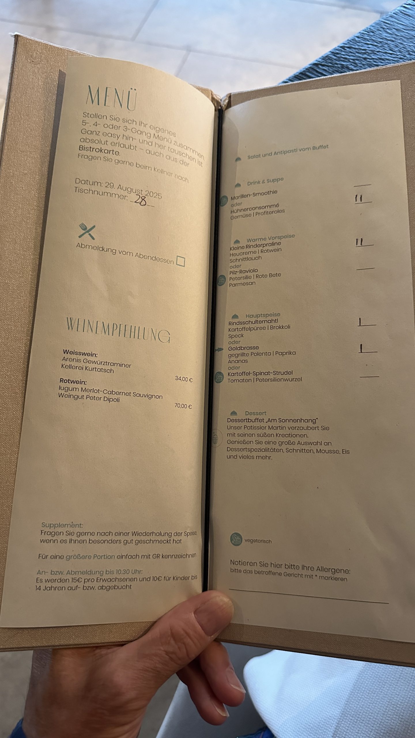 Dorf Tirol ist schön, es gefällt uns besser als Schenna. Das Hotel würden wir nicht noch einmal nehmen. Das Zimmer war sehr gut, imposanter Blick über das Tal. Aber das Hotel ist ziemlich verbaut. Die Fitness Räume sind ohne Fenster. Man kommt vom Wellness Bereich nur über einen separaten Aufzug in die Etagen mit Restaurant, Rezeption und Zimmer. Eine Treppe ist nur außen. Leider war ab Mittwoch der Aufzug defekt, so dass in den Wellness Bereich nur über die Außenanlage kommt. Mit den Filz Hotelschuhen bei Regen suboptimal.