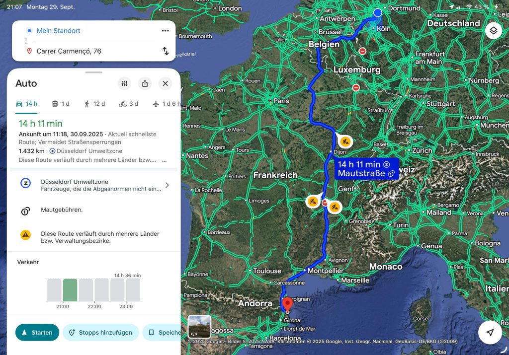 Am Samstag den 04.10.2025, früh morgens. Je nachdem wie ich voran komme, werde durchfahren bis Empuriabrava. Da hab ich eine Möglichkeit mein Auto beim Haus eines Freundes für die Wanderung stehen zu lassen.