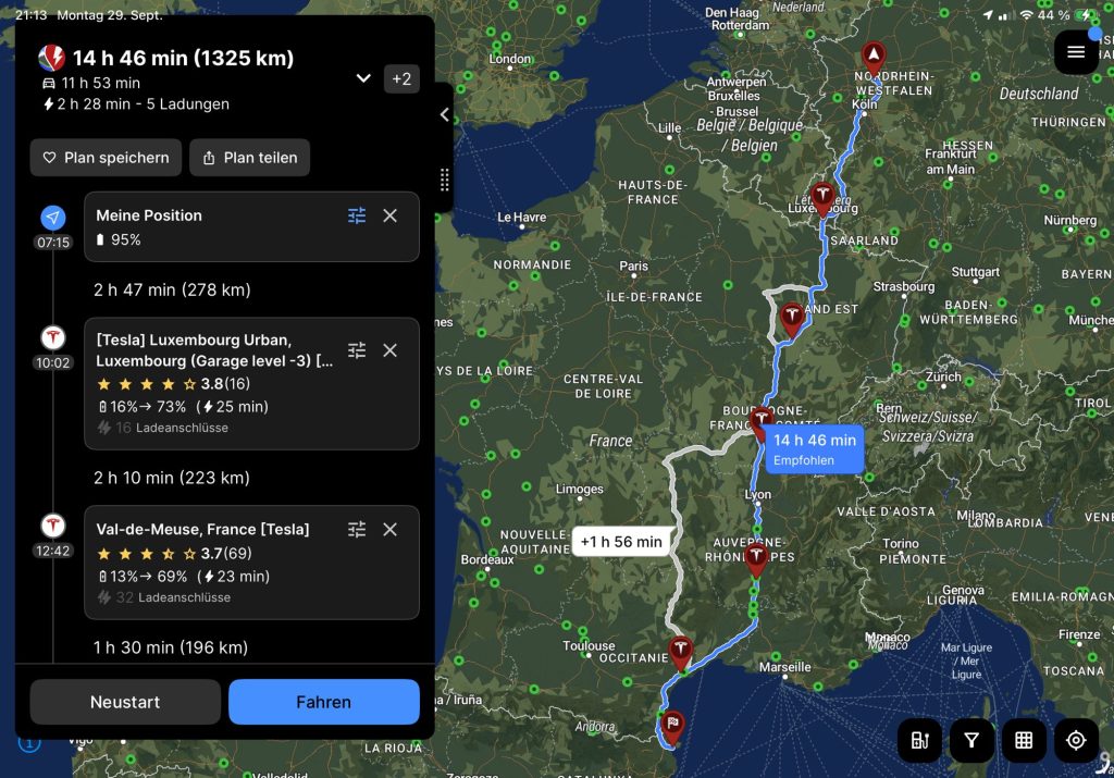 Zieladresse ist Carrer de Carmençó, 76, Castelló d’Empúries. Die Routenplanung bei Google findet 1.319 km, und 13 h 36 min Fahrzeit. A Better Route Planner (ist m.M. nach schon lange nicht mehr „better“) plant 1.324 km und 14 h 46 inkl. Ladezeiten. Ich vertraue da lieber dem Tesla Navi. Das rechnet eine Reisezeit (inkl. Laden) von 15 h 30 min aus.