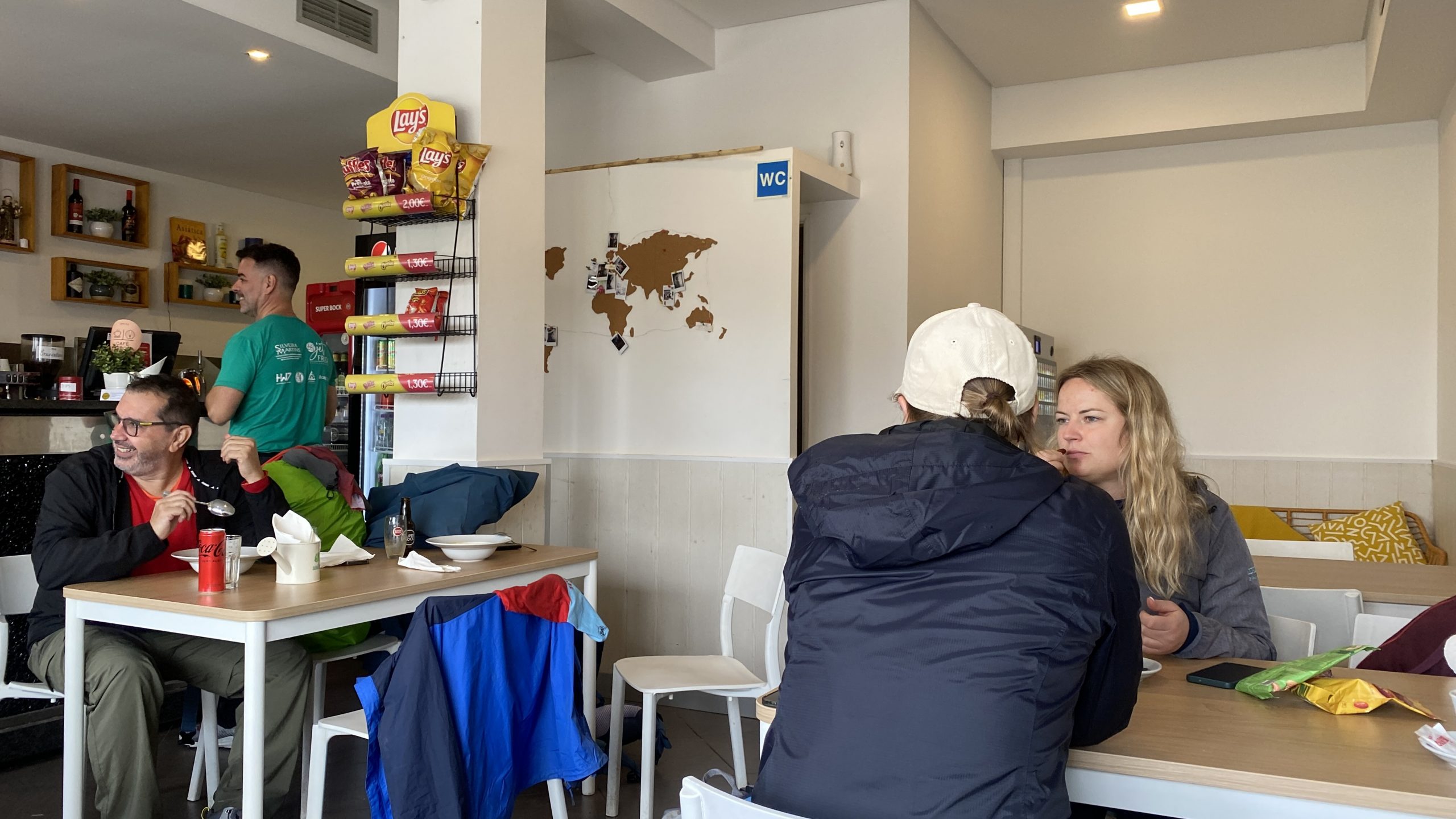 Das Restaurant wird voller. Eine Gruppe mit drei Frauen, eine weitere mit Mutter und Tochter. Sie versuchen was zu essen zu bestellen. Komplizierter geht es nicht. Die eine (rothaarig) will erst sehen wie es aussieht, sie nimmt also ihre Mitpilger als Versuchshasen. Die anderen essen dann irgendwas aus Tüten. Muss wohl gesünder sein.