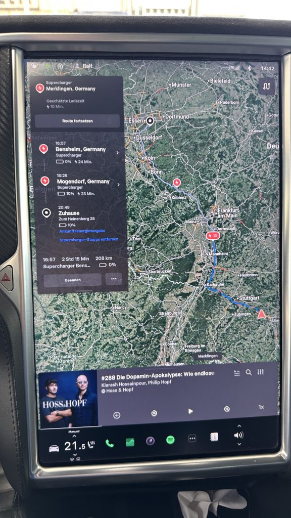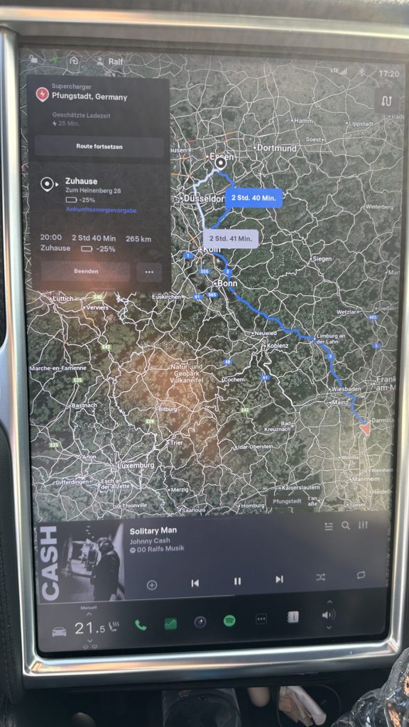 Um 20:15 waren wir zu Hause, und hatten noch eine 10 Minuten Ladung bei Greet and Seet in Haan. Ich war etwas schneller unterwegs, und das Auto meinte eine Zwischenladung wegen zu geringem Energielevel am Ziel einlegen zu müssen. Dann wollte das Navi nicht die A46 bis zur A535 in Wuppertal. Ich hab das ignoriert, und musste feststellen, dass die A46 wegen Brückenabbruch gesperrt war. Eine kleine Umleitung durch das zerklüftete Wuppertal war erforderlich.