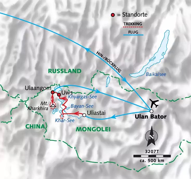 Wir folgen weiter dem Kharkhiraa-Fluss, steigen zum Namiriin-Ekh-Pass hinauf, um bald wieder das Flussufer zu erreichen. Wir überqueren den Fluss und steigen zu einer Alm auf, die zum letzten Mal ein Panorama auf die Turgen-Berge bietet. Hier werden wir von unseren Fahrzeugen erwartet, die uns weiter in die kleine Stadt Ulgii bringen. Hotelübernachtung. 290 km. (F, M, A)