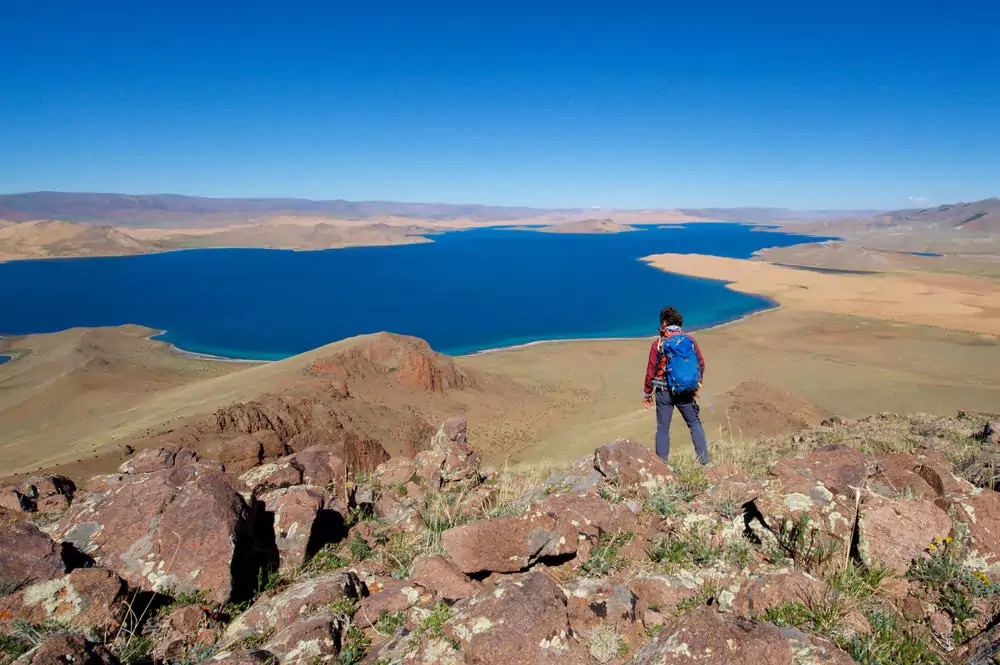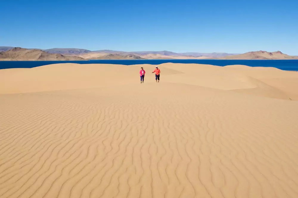 Wir schultern unsere Rucksäcke und wandern am Seeufer entlang, bis wir den ersten Sanddünen-Streifen erreichen. Dieser schiebt sich weit in das smaragdgrüne Wasser hinein und bildet an seinem Ende einen wunderschönen Badeplatz – den lassen wir uns nicht entgehen! Nach einer ausgiebigen Badepause wandern wir über die Dünen und am Seeufer entlang zum Camp zurück. Jurtenübernachtung. (F, M, A)