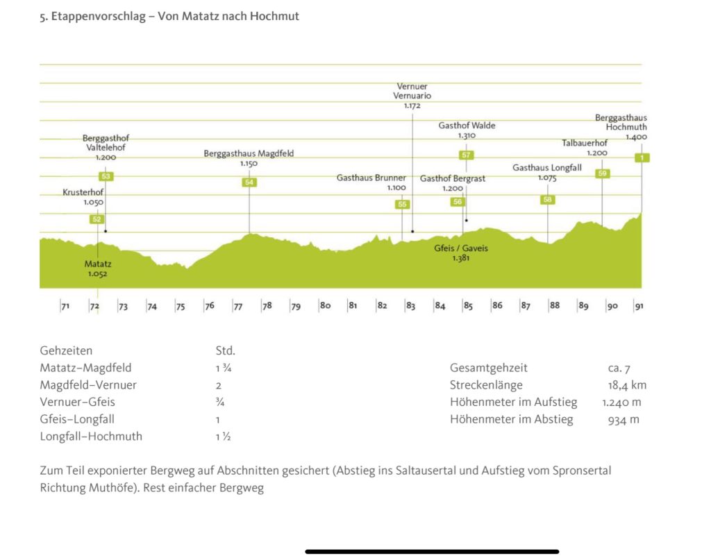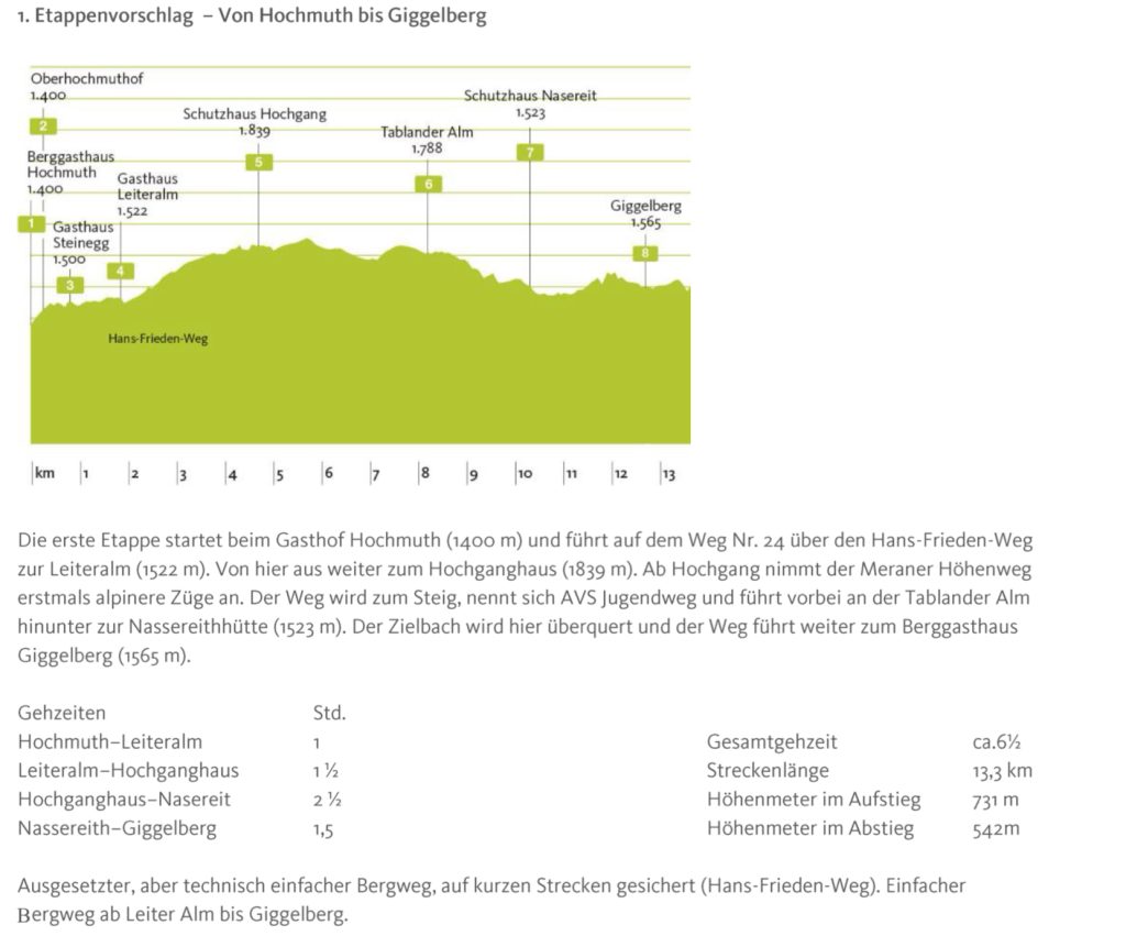 Highlights: Panoramablick auf Meran, Partschinser Wasserfall (97 m, Abstecher lohnt!), urige Einkehrmöglichkeiten wie Nassereith-Hütte.